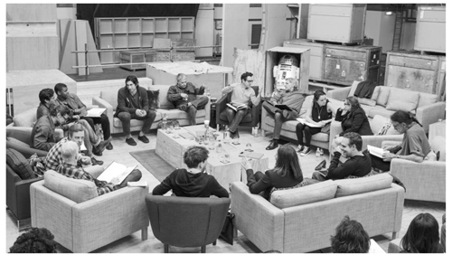 29. April, Pinewood Studios UK: Drehbuchautor/Regisseur/Produzent J.J. Abrams (oben Mitte) und die Schauspieler bei der Leseprobe zu Star Wars: Episode VII mit Harrison Ford, Daisy Ridley, Carrie Fisher, Peter Mayhew, Produzent Bryan Burk, Lucasfilm Präsidentin und Produzentin Kathleen Kennedy, Domhnall Gleeson, Anthony Daniels, Mark Hamill, Andy Serkis, Oscar Isaac, John Boyega, Adam Driver und Drehbuchautor Lawrence Kasdan (im Uhrzeigersinn von rechts). Bild: David James. Lucasfilm Ltd. & TM.