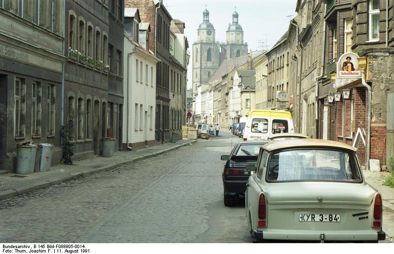 Typischer Zustand der Städte in der DDR zur Zeit der Wiedervereinigung; hier Wittenberg (1991)