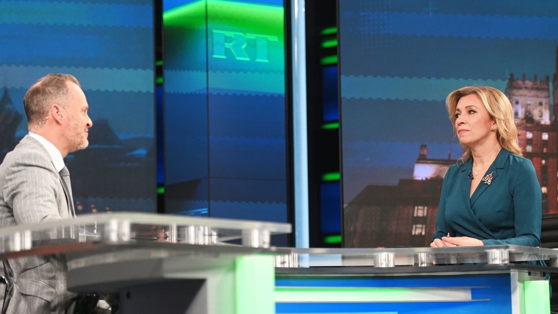 Hoffnungsvoller Sendebeginn auf Deutsch Ende 2021: RT-DE-Moderator Stefan Pollak und die Sprecherin des russischen Außenministeriums Maria Sacharowa im Studio von RT DE in Moskau, 16. Dezember 2021 Bild: Sputnik / Владимир Астапкович/РИА Новости