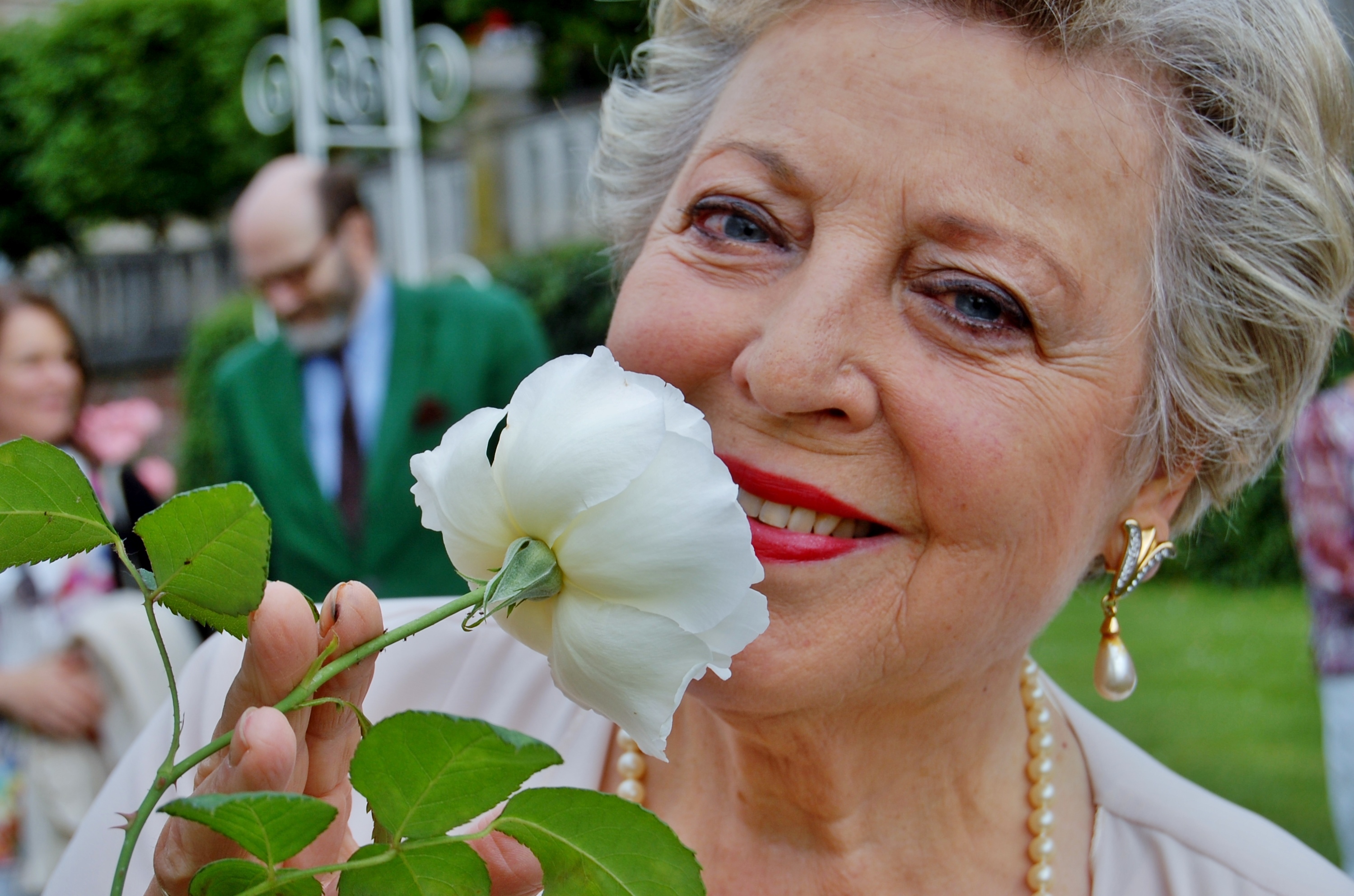 Marie-Luise Marjan schnuppert an einem Exemplar der 2010 nach ihr benannten Edelrose (Juni 2014)