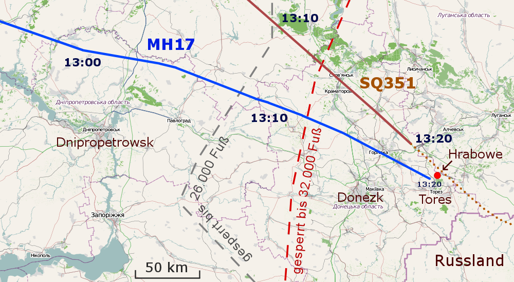 Flugverlauf von MH17 und SQ351 um 12:55–13:27 UTC mit Luftraum-Sperrzonen