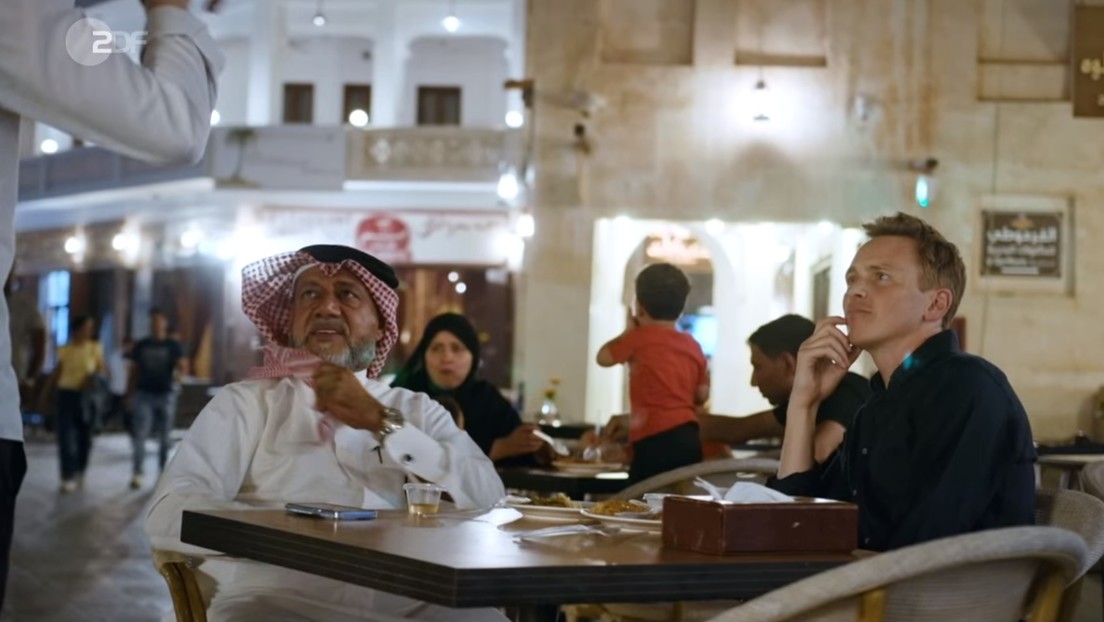 Interviewende: Der frühere Fußballer und Katars WM-Botschafter Khalid Salman (li.) und ZDF-Reporter Jochen Breyer. Bild: Screenshot: ZDF Heute-Journal, 07.11.2022 / RT