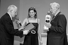 Karl-Heinz Heimann (links) überreicht Bert Trautmann (rechts) den Ehren-MAX für sein Lebenswerk auf der Gala der Deutschen Akademie für Fußball-Kultur 2008 in Nürnberg