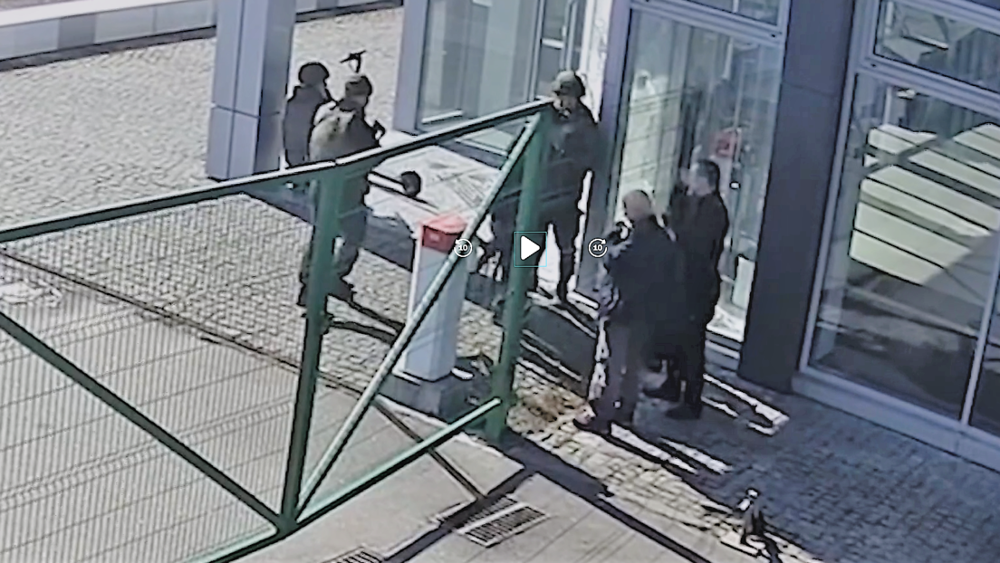 Szene aus dem CNN-Bericht: Eine Überwachungskamera zeigt angeblich russische Soldaten, die mit zwei Mitarbeitern eines Fahrzeughandels sprechen. Anschließend schießen die Soldaten den Zivilisten in den Rücken. Bild: CNN / RT DE