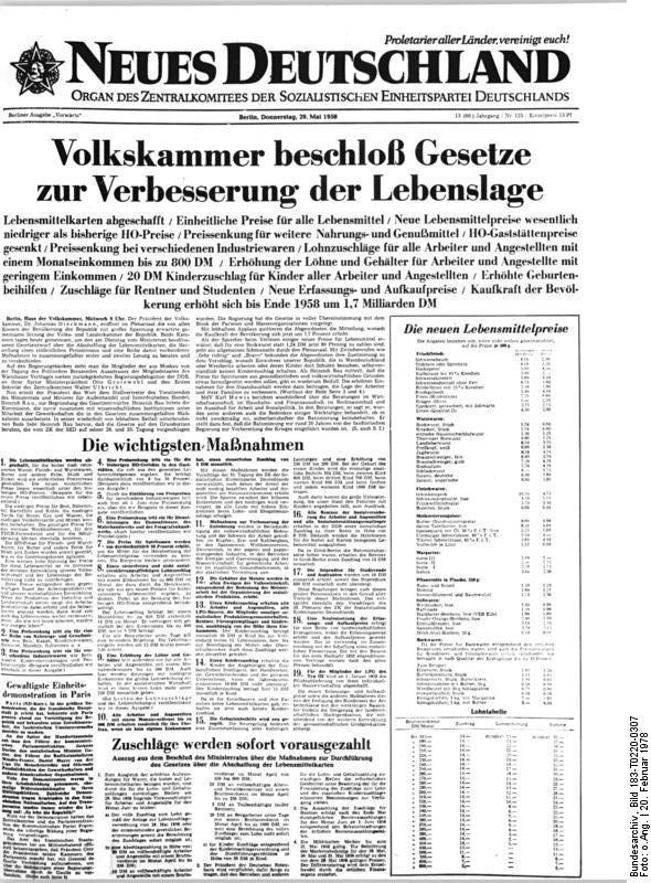 Titelseite der Ausgabe vom 29. Mai 1958 zur beschlossenen Lohnerhöhung und Abschaffung von Lebensmittelkarten[5]