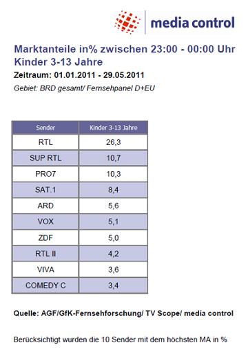 Top 10 der beliebtesten Kindersender zwischen 23 und 0 Uhr Facts: Marktanteile in Prozent | Kinder 3 bis 13 Jahren | Gebiet: BRD gesamt | Fernsehpanel: D+EU | Zeitraum: 01.01. - 29.05.2011