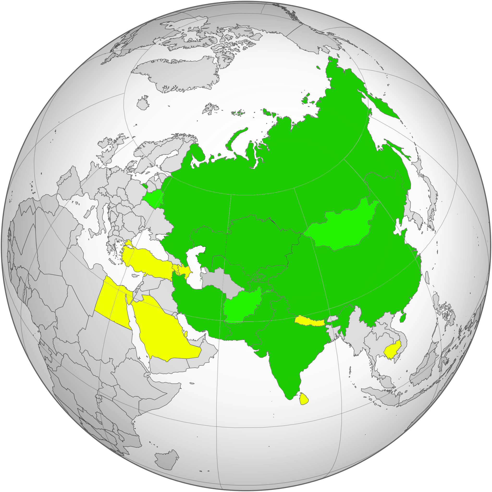 Staaten der Shanghaier Organisation für Zusammenarbeit (SCO), dunkelgrün: Mitglieder, hellgrün: Beobachter, gelb: Dialogpartner