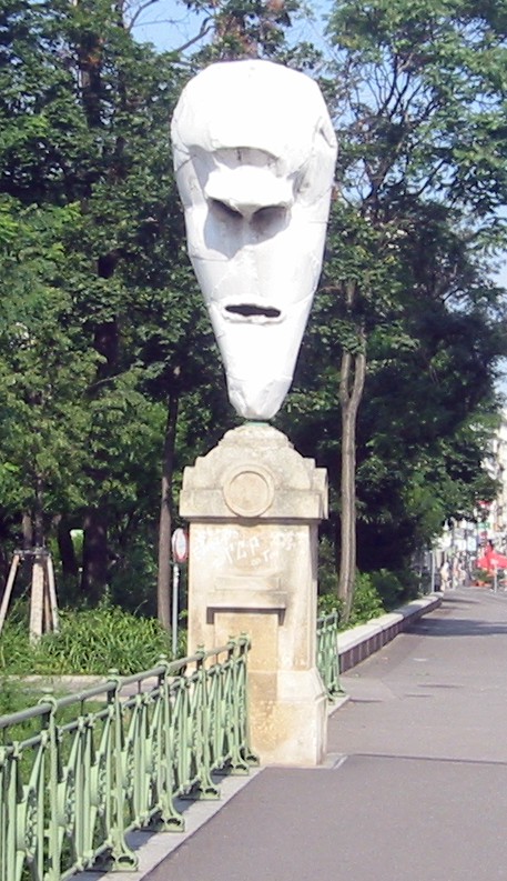 Einer der vier "Lemurenköpfe" (Aluminium und weiße Lackfarbe) auf der Stubenbrücke in Wien von Franz West