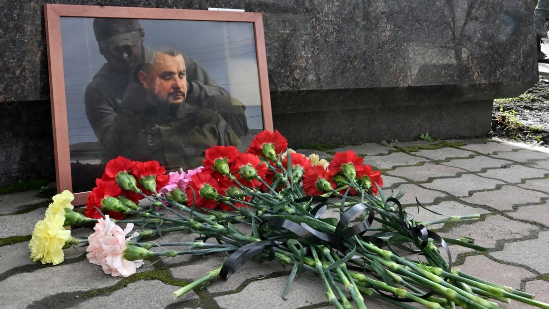 Im Bild: Blumen in der Nähe eines Porträts des russischen Militärbloggers Wladlen Tatarski in Lugansk. Bild: Sputnik / Evgeny Biyatov