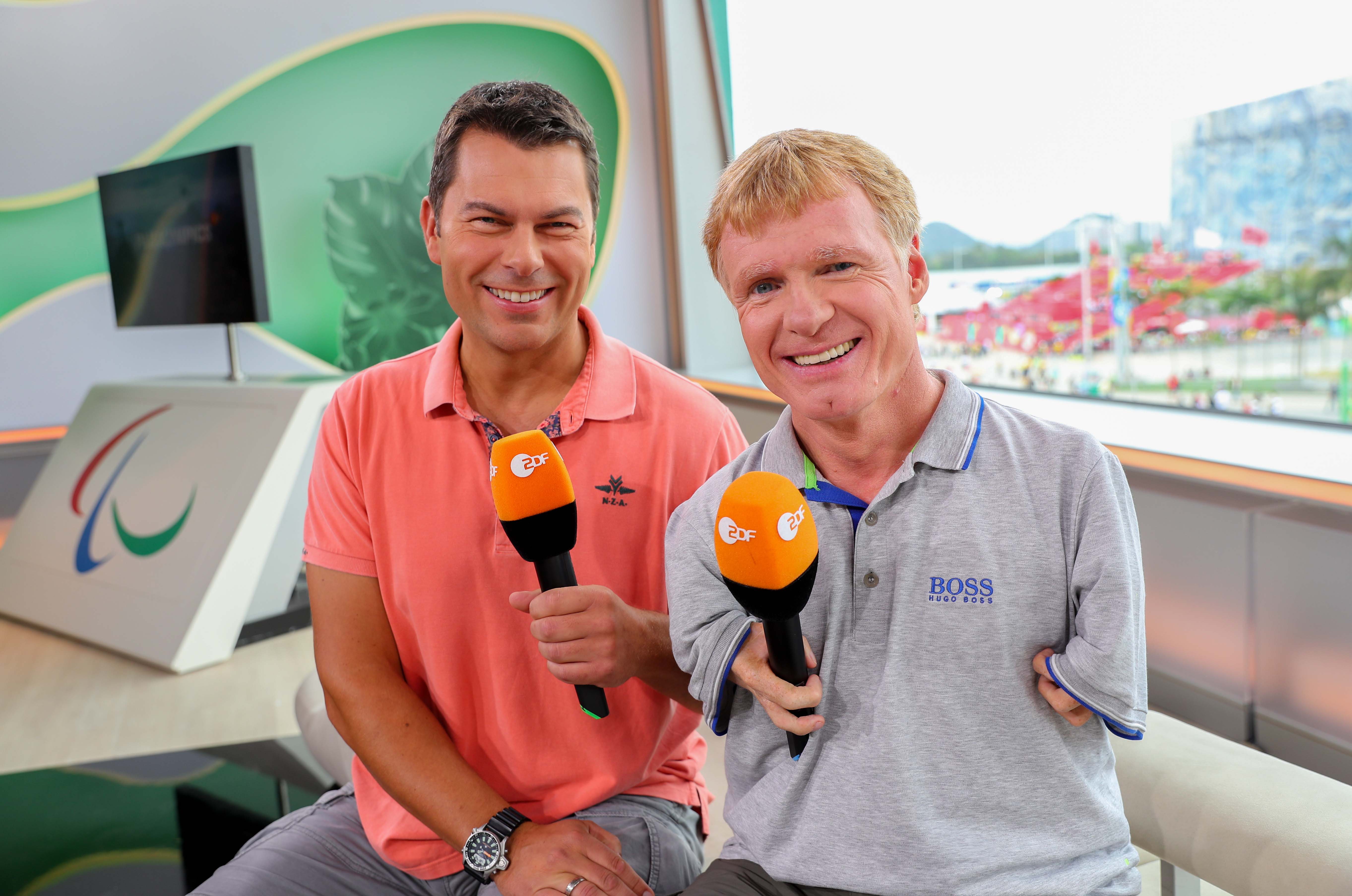 Moderator Yorck Polus und ZDF-Paralympics-Experte Matthias Berg im ZDF-Studio im Rahmen der Sommer-Paralympics 2016 in Rio de Janeiro. Bild: "obs/ZDF/Kay Nietfeld"
