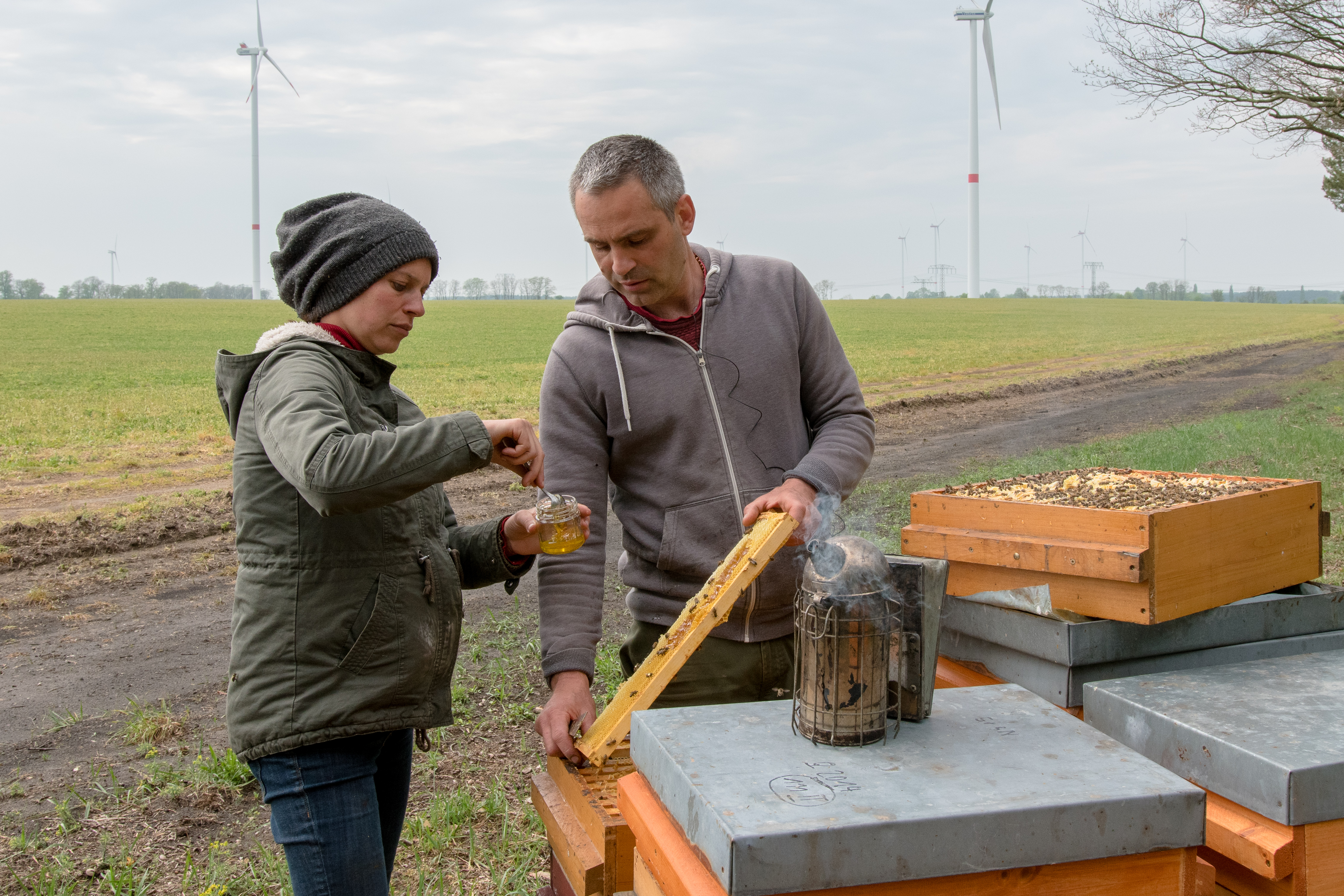 Glyphosat im Honig: Imkerpaar Sebastian und Camille Seusing bei der Entnahme von Honigproben. Bild: Aurelia Stiftung Fotograf: Florian Amrhein
