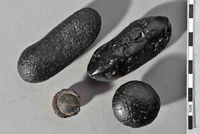 Tektite aus Australien. Durch die Wucht des Einschlages wurden die Glaskörper tausende Kilometer weit geschleudert. Einige verließen die Erdatmosphäre und wurden beim Wiedereintritt verformt Quelle: Institut für Geowissenschaften, Universität Heidelberg (idw)