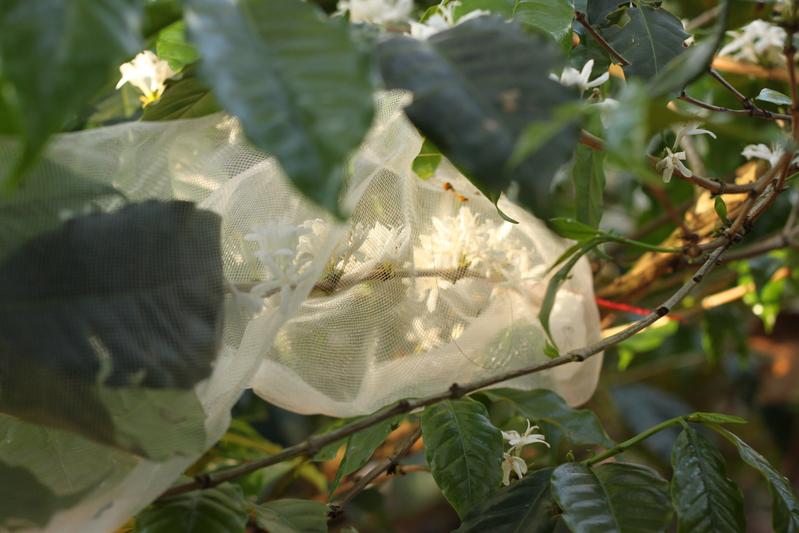 Ein feines Netz hält Bestäuber von Kaffeeblüten fern. Für die Qualität des Kaffees ist das eher abtr Quelle: (Foto: Alice Claßen) (idw)