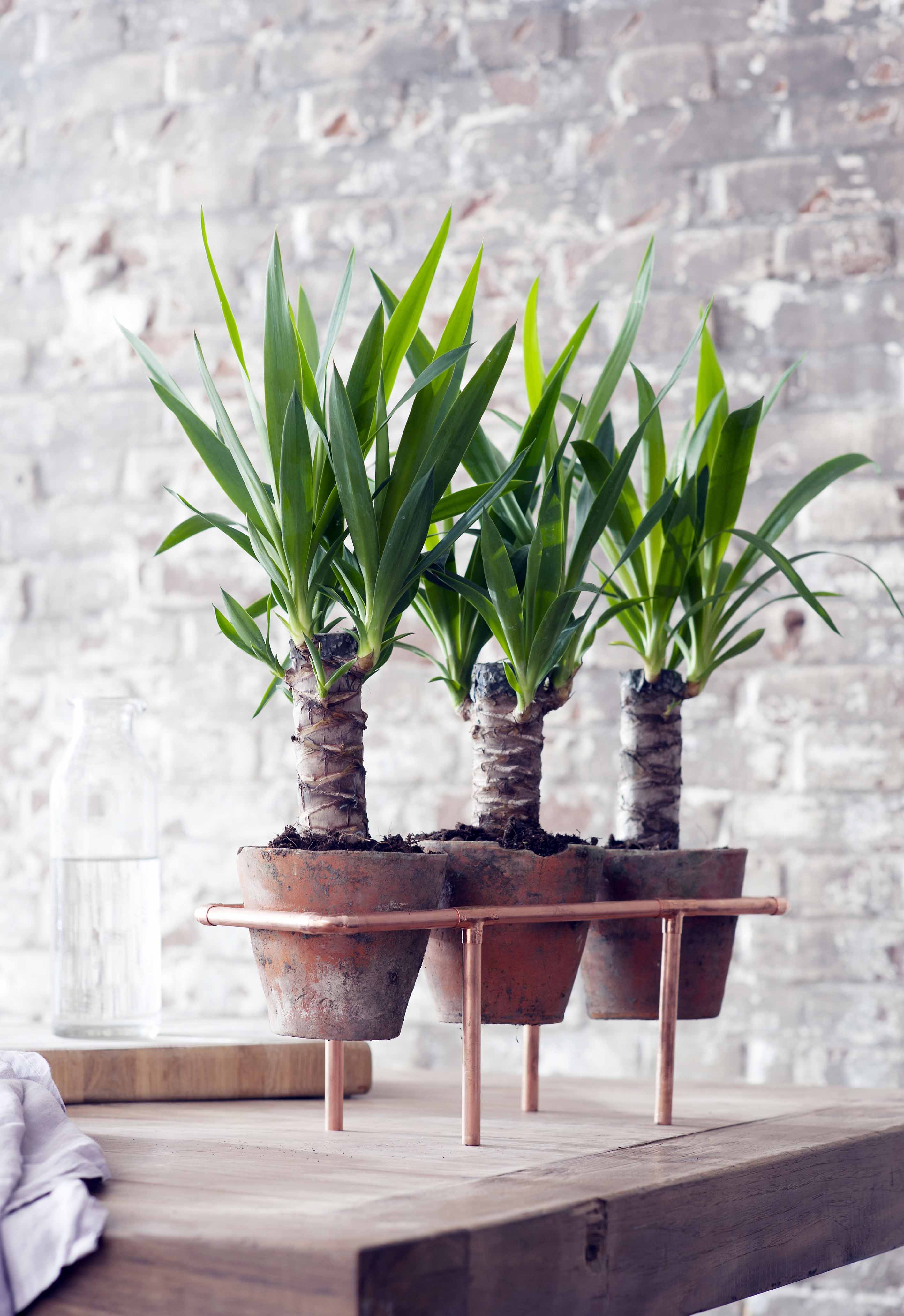 Yucca-Trio in selbstgemachten Kupfer-Pflanzenständer, Bild: "obs/Blumenbüro/Pflanzenfreude.de"
