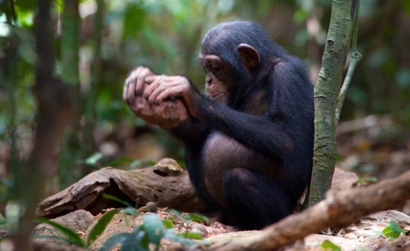 Schimpanse beim Nüsseknacken mit einem Steinhammer. Quelle: Mark Linfield (idw)