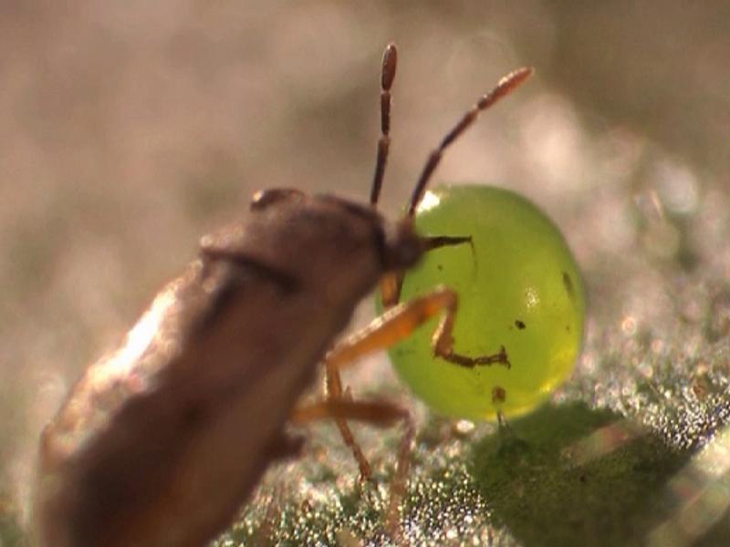 Eine Raubwanze wird durch grüne Blattduftstoffe angelockt und vertilgt daraufhin ein Tabakschwärmer-Ei. Die Pflanze hat sich so indirekt ihres Fraßfeindes entledigt. Quelle: Merit Motion Pictures, Winnipeg, Manitoba, Canada (idw)