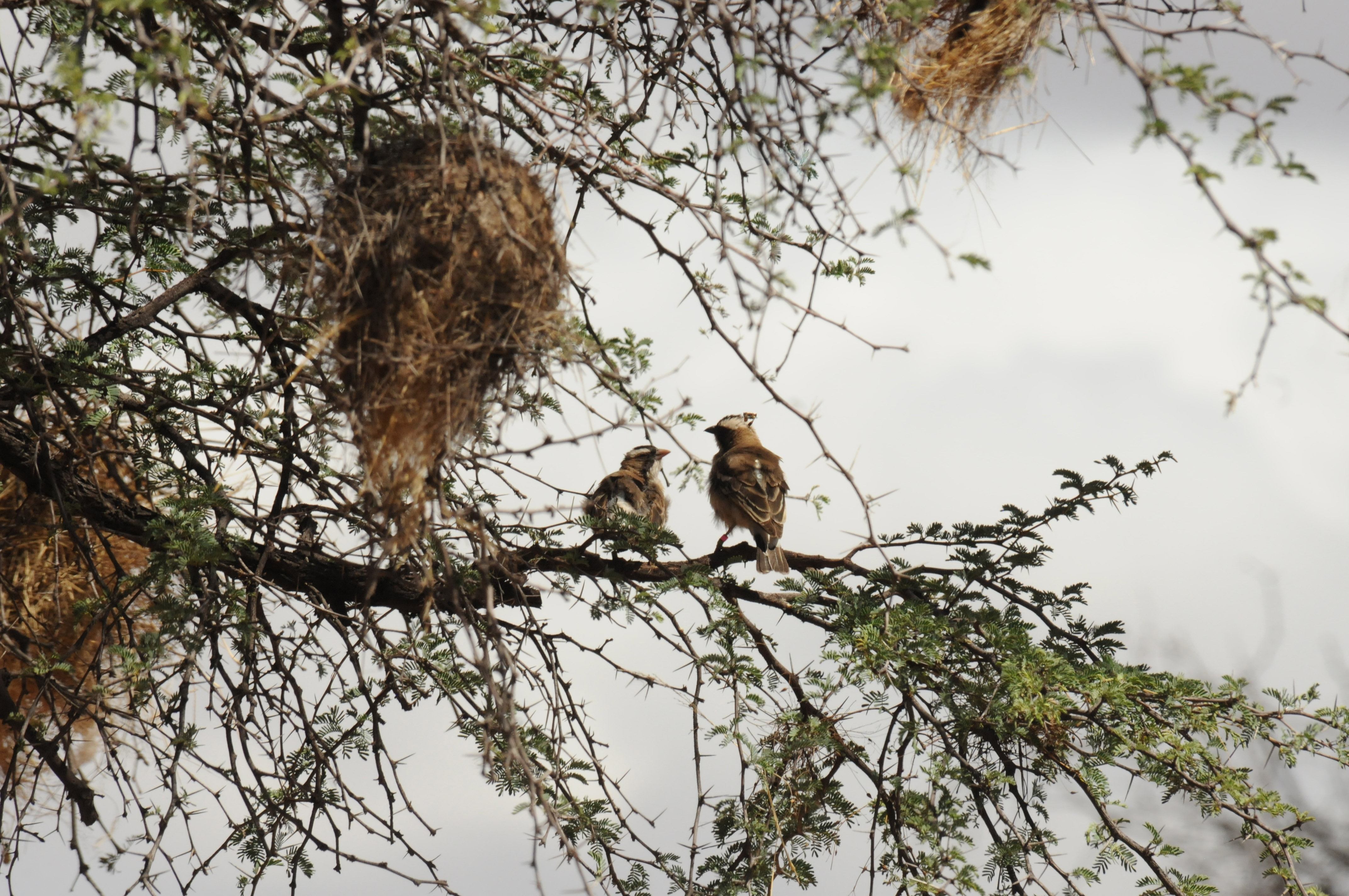 Ein Mahaliweber-Paar sitzt in einem Baum unter ihrem Nest. Das Männchen (rechts) trägt einen Mikrofonsender auf dem Rücken und einen Sender zum Messen der Gehirnaktivität auf dem Kopf. Quelle: Susanne Hoffmann (idw)