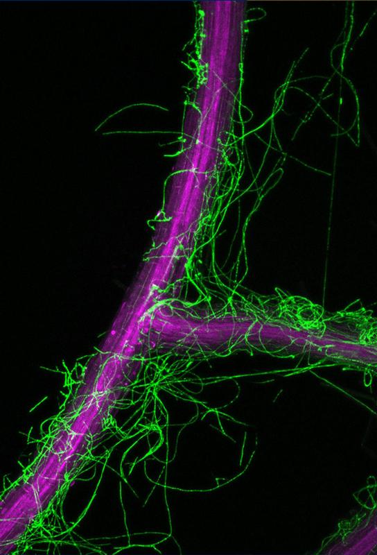 Mikroskopischer Ausschnitt einer Arabidopsis thaliana-Wurzel (violett), die mit Pilzgeflecht von Colletotrichum tofieldiae (grün) umgeben ist. Quelle: MPI f. Pflanzenzüchtungsforschung (idw)