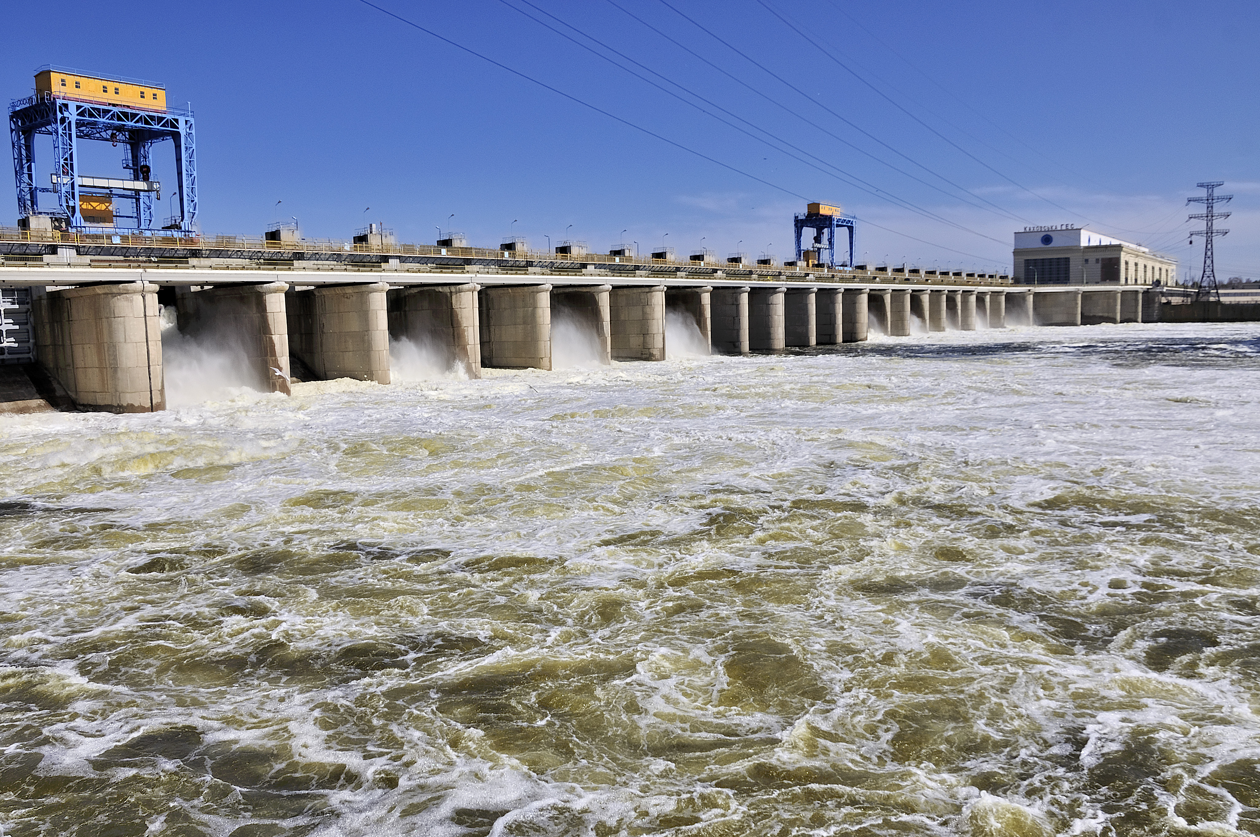 Wasserkraftwerk Kachowka (rechts hinten) und Staumauer des Stausees (Blick von der unteren, westlichen Seite)