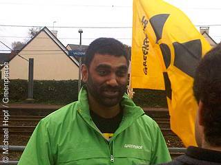 Kumi Naidoo beim Verladebahnhof in Valognes. Bild: Michael Hopf / Greenpeace