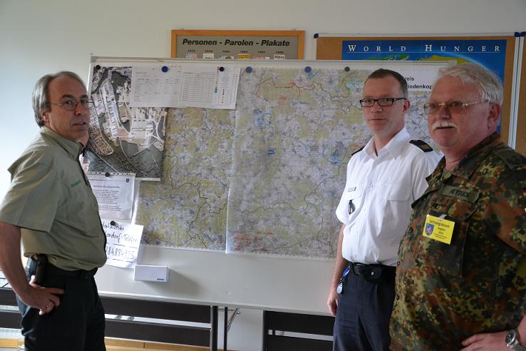Gemeinsame Lagebesprechung an der Einsatzkarte (v. l. n. r.) Dr. Horst Marohn (Hessen-Forst, Kassel), Lars Schäfer (Kreisbrandinspektor des Landkreises Hessen, Marburg Biedenkopf) und Oberleutnant Wolfgang Heyduck (Landeskommando Hessen). Foto: Hartmut Payer