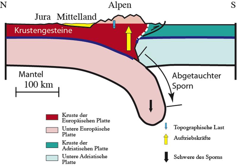 Schematischer Querschnitt durch die Alpen: Der gelb eingefärbte Trog unter dem Mittelland wird hauptsächlich durch die Schwere des Sporns gebildet. Diese biegt die Europäische Platte nach unten. Quelle: Nature Communications (idw)