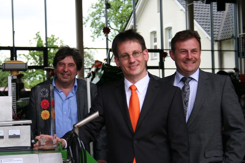 Ausgezeichnet: Die Entwickler des BoniRob freuen sich über dessen Prämierung durch die Initiative „365 Orte im Land der Ideen“ (von links): Prof. Dr. Arno Ruckelshausen (HS Osnabrück), Dr. Florian Rahe (Amazone), Ralf Donath (Bosch). Quelle: (idw)