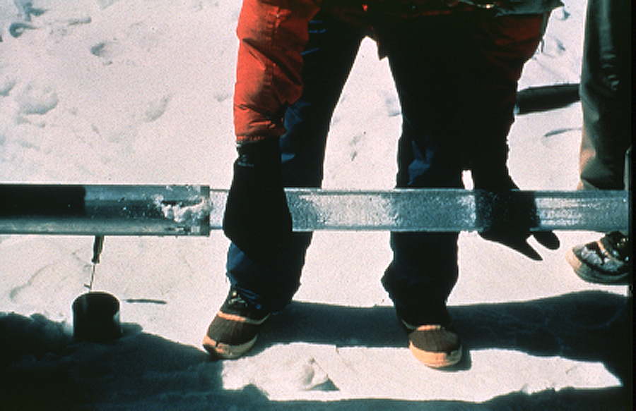 Eisbohrkern wird aus dem Hohlkernbohrer entnommen
