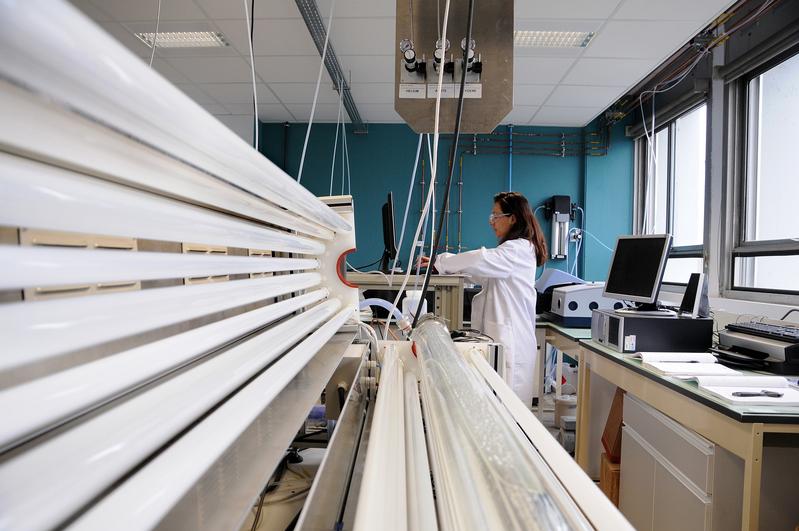 Im Labor des IRCELYON in Lyon setzten die Wissenschaftler das Luftgemisch abwechselnd Licht oder Dunkelheit aus und maßen die Größe der Partikel. Im Bild zu sehen ist das Glasrohr, in der sich die Reaktion abspielt, sowie die Beleuchtung, mit der Tag und Nacht simuliert wurde. Quelle: Foto: Eric Le Roux / Université Claude Bernard Lyon 1 (UCBL)/ IRCELYON (idw)