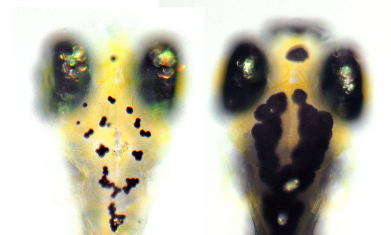 Tarnung bei Zebrafisch-Larven: Die linke Larve ist hellem Licht ausgesetzt und schwach pigmentiert, Quelle: Foto: Stephan Neuhauss / UZH (idw)
