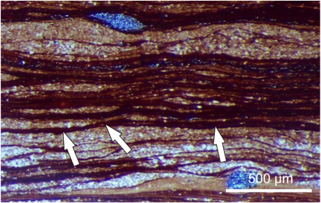 Durchlichtmikroskopische Aufnahme eines 1,1 Milliarde Jahre alten Gesteins aus der Touirist-Formation in Mauretanien. Bei den dunklen Lagen (hervorgehoben durch die Pfeile) handelt es sich um versteinerte Mikrobenmatten, die hauptsächlich von Cyanobakterien aufgebaut wurden. Die Wellenform deutet auf eine Flachwasserbildung hin, ein Bereich, der einen hohen Nährstoffeintrag gewährleistet. Die blauen Bereiche sind Pyrit. Quelle: Foto: Universität Göttingen (idw)