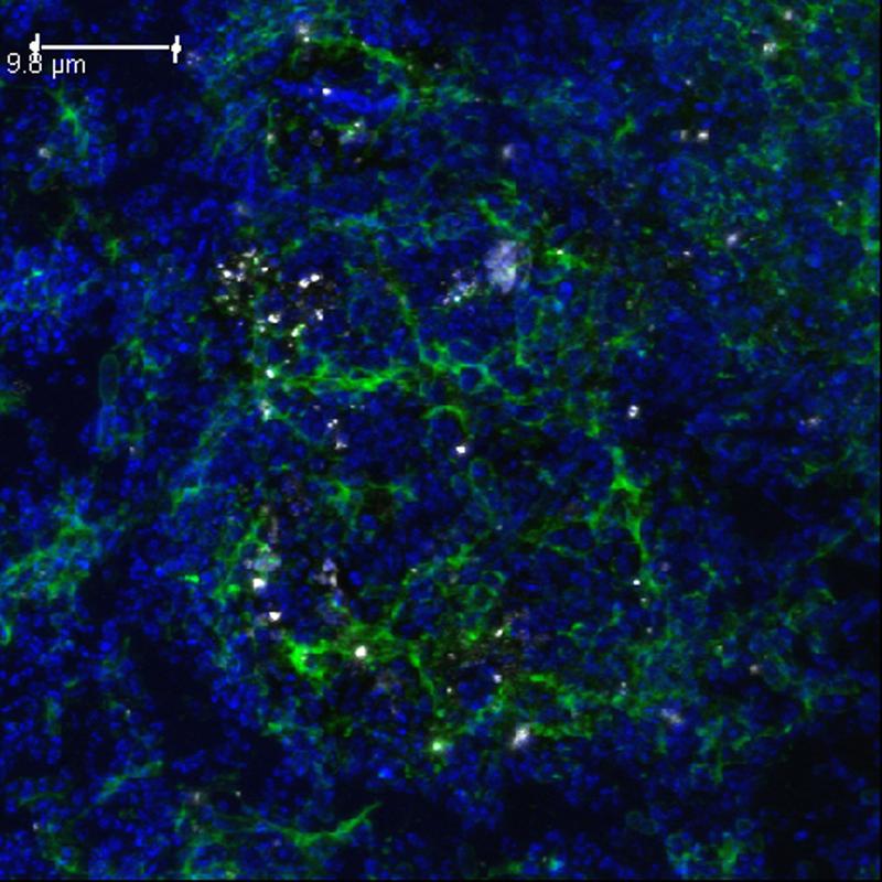 Das Bild zeigt stark vergrößert den Biofilm einer sulfatreduzierenden Bakterienart. Die Bakterien sind in blau zu sehen, dazwischen hat sich ein Biofilm ausgebildet, in dem in weiß ausgefallenen Dolomitkristalle zu sehen sind. Das Bild wurde aufgenommen mit einem konfokalen Laser-Scanning-Mikroskop Quelle: ETH Zürich/Uni Zürich (idw)