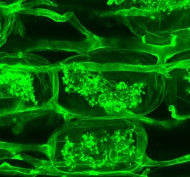 Bäumchenförmige Arbuskel in Wurzelzellen. Bild: uni-muenchen.de/Priya Pimprikar