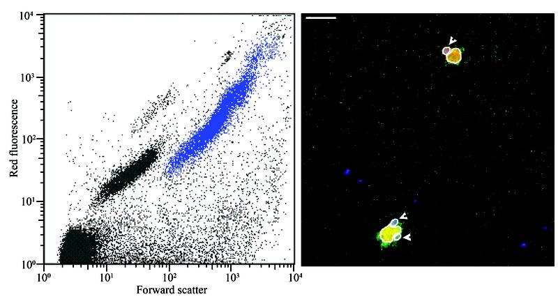 Links: Daten von dem Zellsorter, mit dem das Rätsel um die Symbiose gelöst werden konnte. Die blauen Punkte stellen die Population der 1 bis 3 Mikrometer großen Organismen dar, zu denen auch UCYN-A gehört. Rechts: Die nanoSIMS-Bilder zeigen die Aufnahme von Kohlenstoff und Stickstoff (grün) in den Zellen. (Größenmaßstab: 3 Mikrometer). (Quelle: Rachel Foster) Quelle: Rachel Foster) (idw)