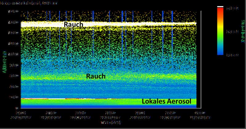 Die Lidar-Messungen aus Leipzig vom Abend des 22. August 2017 zeigen zwei Rauschschichten: eine starke in ca. 16km Höhe und eine schwächere in ca. 6km Höhe. Quelle: Grafik: Holger Baars, TROPOS (idw)