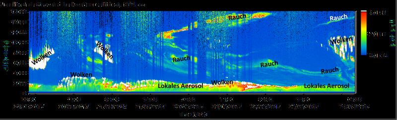 Die Lidar-Messungen aus Kosetice (Tschechische Republik) vom 20. bis 24. August 2017 zeigen, wie am 21.8. die Rauchfahne aus Kanada in 11km über den Ort zieht und sich in zwei Schichten aufspaltet. Quelle: Grafik: Holger Baars, TROPOS (idw)