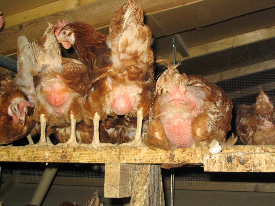Geflügelmast: Hennen mit kahlen Stellen in einer Bodenhaltung