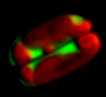 Laser-Scanning-Fluoreszenz-Aufnahme der marinen Diatomee Amphora coffeaeformis. Rot: autofluoreszierende Chloroplasten, grün: Lipidmembranen (gefärbt mit MDY-64). Martin Beutler, bionsys GmbH, Bremen, Deutschland