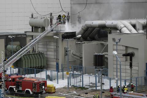 Feuer im Atomkraftwerk (AKW) Kruemmel (Betreiber Vattenfall) . Bei dem Brand in einer Transformatorenanlage fing auch Oel Feuer. Etwa 100 Feuerwehrleute bekaempften den Brand gut 2 Stunden lang. Bild: Martin Langer / Greenpeace