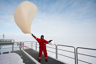 Die Ozonsondierungen werden bei jedem Wetter durchgeführt – auch wenn es an der Neumayer-Station stürmt.