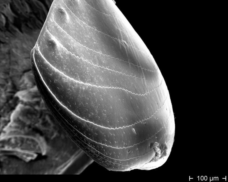 Rasterelektronenmikroskopische Aufnahme eines Körpersegments der neu entdeckten Art. Das Außenskelett ist sehr dünnwandig und nur an einigen Stellen durch Knoten verdickt. Die Bilder sind Schwarz-weiß, da sie durch einen Elektronenstrahl und nicht durch einen Lichtstrahl entstehen. Quelle: Foto: Dr, T. Wesener, ZFMK, Bonn (idw)
