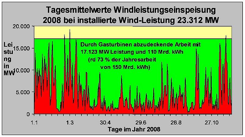 Die rote Fläche liefern die 20.000 Windkraftwerke die über ganz Deutschland verteilt arbeiten wenn der Wind weht, die grüne Fläche muss durch Erdgaskraftwerke abgedeckt werden, falls die Kernkraftwerke nicht mehr zur Verfügung stehen.
