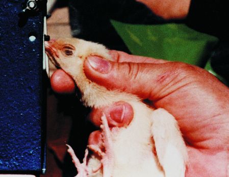 Bei einem Huhn wird der Schnabel kupiert, um Kannibalismus zu verhindern.