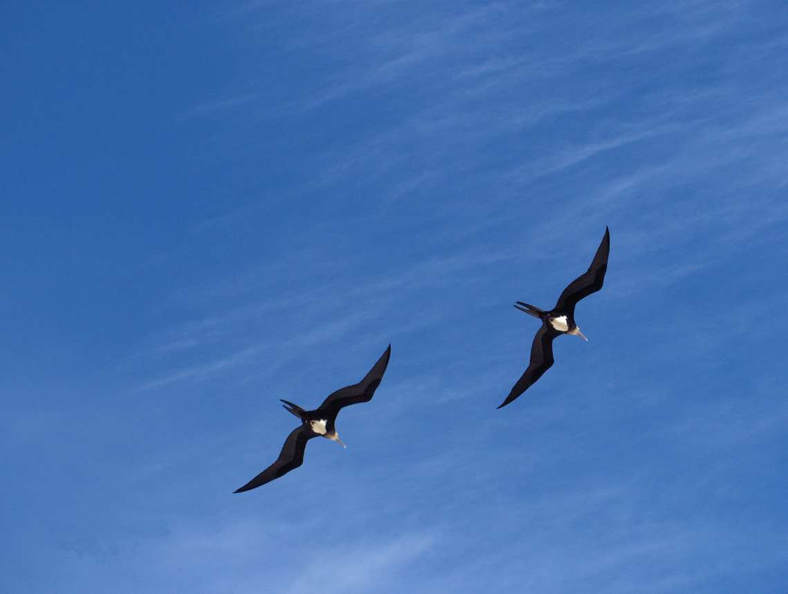 Bindenfregattvögel (Fregata minor): Weibliche Fregattvögel lassen sich an der weißen Unterseite identifizieren.