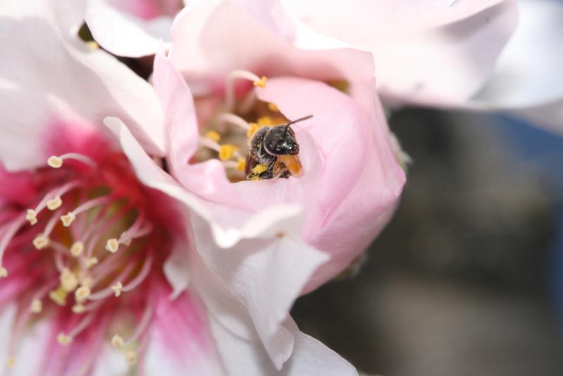 Eine Scheinlappenbiene verlässt eine Mandelblüte in Nordkalifornien. Quelle: Foto: Alexandra-Maria Klein (idw)