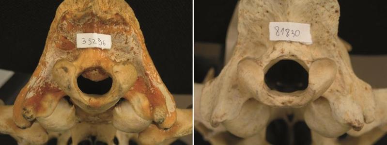 Foramen magnum von Löwenschädeln (Panthera leo); rechts: Schädel eines gesunden Löwen, links: missge Quelle: Foto: Dr. Merav Shamir (idw)