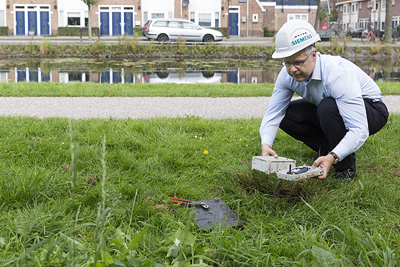 Sensoren und eine intelligente Auswertung ihrer Daten können Schäden an Deichen frühzeitig erkennen und so auch größere Abschnitte absichern. Die von Siemens entwickelte Technologie hat ihren Praxistest bestanden: Derzeit ist eine Kette von Sensoren auf einer Länge von fünf Kilometern an einem Deich in Amsterdam installiert und liefert permanent Informationen über dessen Zustand. Nach Abschätzungen von Experten könnte das automatische Deichmonitoring die Instandhaltungskosten um zehn bis maximal 20 Prozent senken. Ein Siemens-Mitarbeiter kontrolliert die Datenübertragungsbox mit den im Deich verbauten Sensoren.
