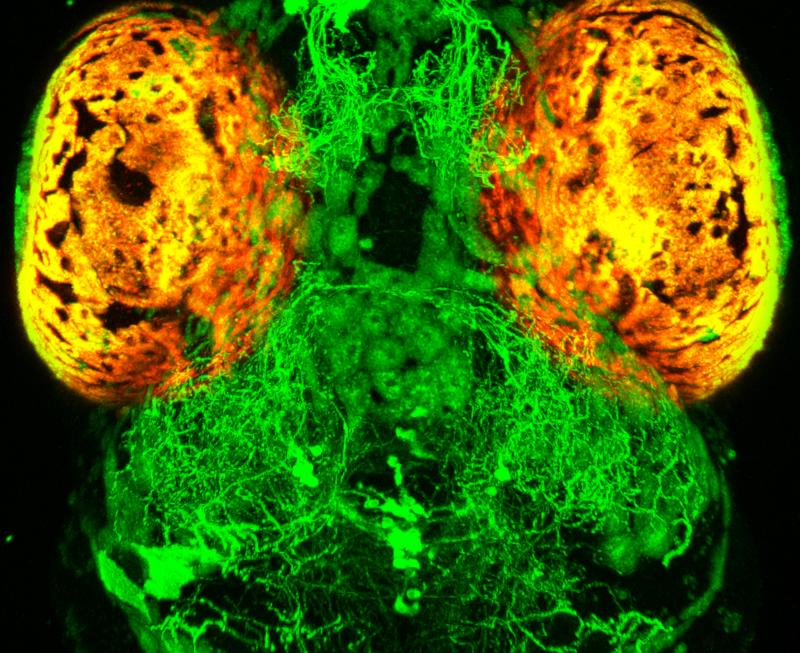 Eine neue Studie zeigt, dass serotonerge Nervenzellen (grün) beeinflussen, wie das Zebrafischgehirn Quelle: (c) MPI für Neurobiologie / Filosa (idw)