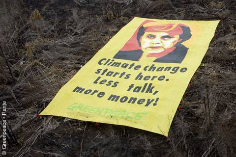 Greenpeace-Aktivisten haben heute in Riau auf der indonesischen Insel Sumatra gegen das Abholzen der Urwälder für Palmölplantagen protestiert. Die Umweltschützer haben ein 20 mal 50 Meter großes Banner mit dem Konterfei von Bundeskanzlerin Angela Merkel auf kürzlich gerodeten Urwaldboden gelegt. Bild: Greenpeace / Rante