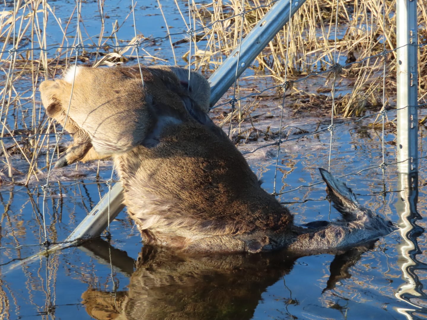 Reihenweise bleiben Rehe auf der Flucht vor dem Hochwasser im Nationalpark Unteres Odertal im Wildschweinzaun hängen und ertrinken. Bild: Wildtierschutz Deutschland e.V. Fotograf: privat/Wildtierschutz Deutschl.